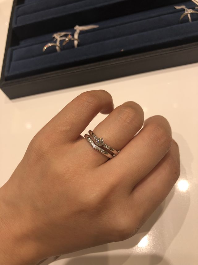 取り扱っているデザイン数がとても多いのですが、店員さんがおすすめして下さったリングだけではなく、少しでも気になったものは何本でも試着させて頂けるので、後悔せず納得のいくまで自分に合う指輪を選ぶことができるお店だと思います。店員さん自身が楽しんで、わたしたちと同じ気持ちになって一緒に選んで下さるので、楽しくリングを選ぶことができました。