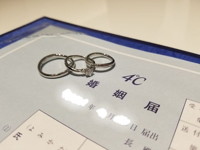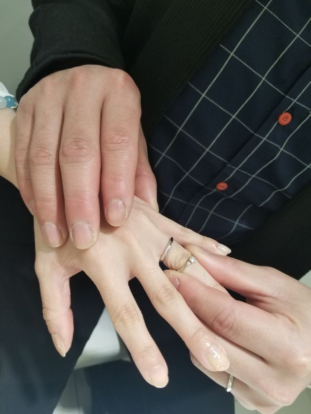 婚約指輪、結婚指輪共に指が綺麗に見える細めのもの、リングがウェーブになっている指長効果の指輪を選びました。
