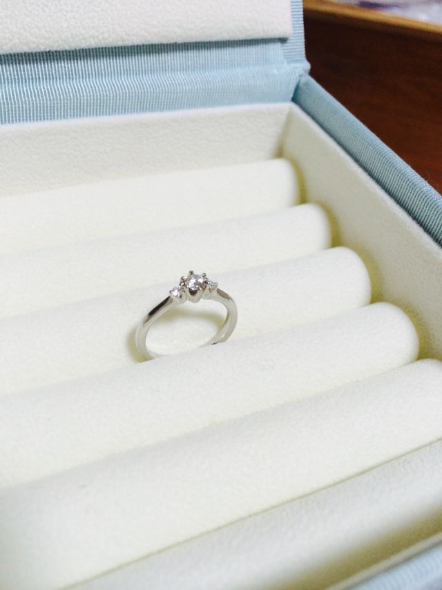 インターネットで下見をしていましたが、実際に試着してみなくてはわからずお店に行きました。試着し始めても、私の手は小さく指も短いので大きなダイヤが馴染まず、どれも買う気にはなれませんでした。そこで店員さんが1つダイヤではなく3つダイヤのものを勧めてくださり、試着してみると、ダイヤの光が分散され、少し手に馴染み、3つダイヤにしようと決めました。リングの形も一番シンプルなストレートが私の手には合っていたのでこの指輪に決めました。