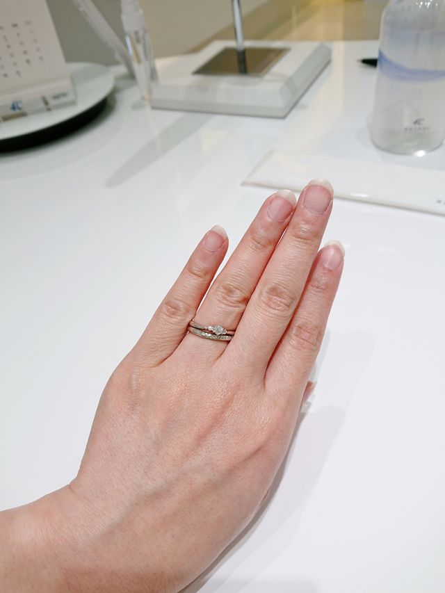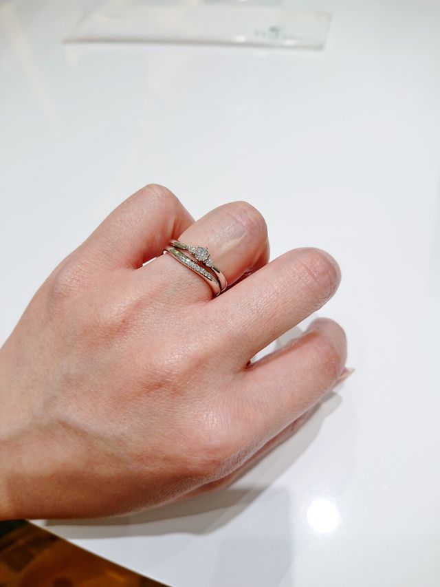 ダイヤは小さいですが、ダイヤの小ささが気にならないくらい全体的にとても綺麗で、今まで試着したブライダルリングの中で一番しっくりきました。