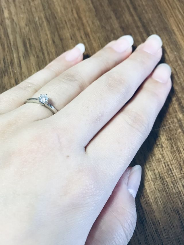 柔らかい印象で、ダイヤの良さが際立つようなデザインのものにしました。結婚指輪との組み合わせなどを考えつつ候補の指輪を実際につけてみると、手指の見え方がそれぞれ違ったので、最終的には指輪も手指も綺麗に見えるものに決めました。