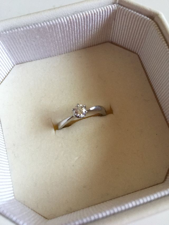 普段使いもできるようにとシンプルなデザインのものを選びました。結婚指輪と重ねづけしています。いくつか試しにはめてみたところ、少しカーブしているリングの方が指が細く見えるように感じたので、一粒ダイヤのカーブがかったリングをえらびました。