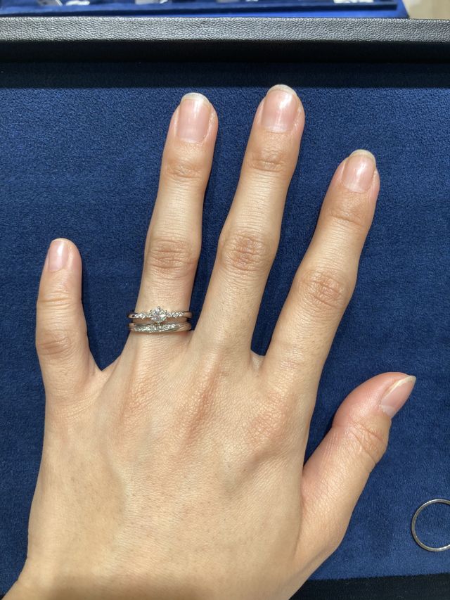 5店舗以上見に行ったなかでデザインがダントツ好きでした。細身でつけやすく、サイドメレのサイズ感、配置もストライクでした。またストレートの形だがウェーブがかっているが指が綺麗に見えるし、さまざまなデザインと合わせやすいと感じた。