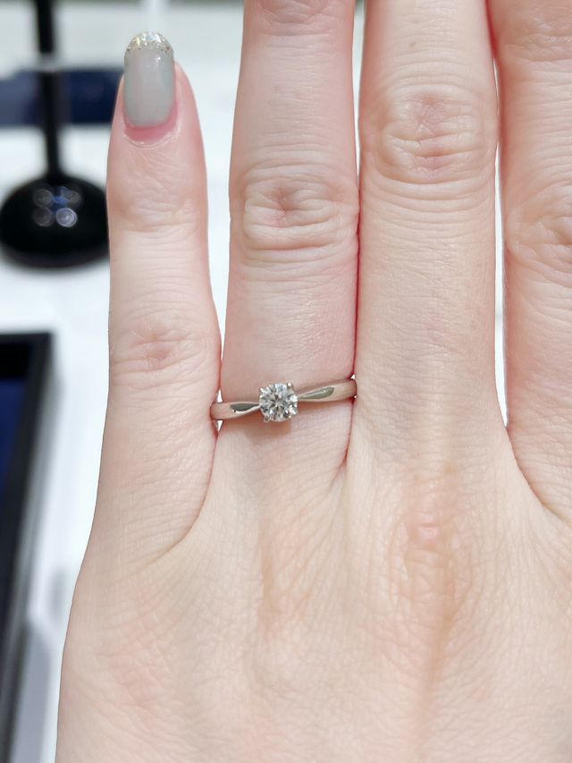 外資系の婚約指輪によくみられるしっかりとしたデザインに惹かれて試着してみました。華奢な婚約指輪にはあまりないダイヤの4点どめと、シンプルな