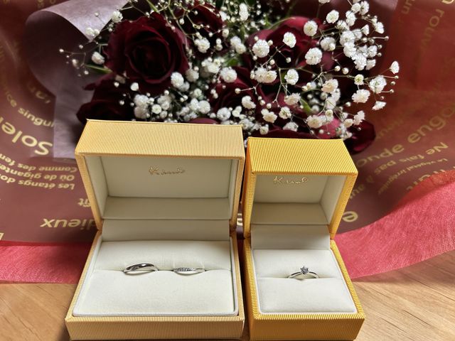 結婚指輪について、私はストレートの形が良くて、パートナーはウェーブの形がお気に入りでした。最初は、2人とも全く同じデザインを希望していましたが、最終的には2人の理想とペアに見える似たデザインをそれぞれ選び、セットっぽい組み合わせにしました。私はリボン、彼はウェーブを選びました。