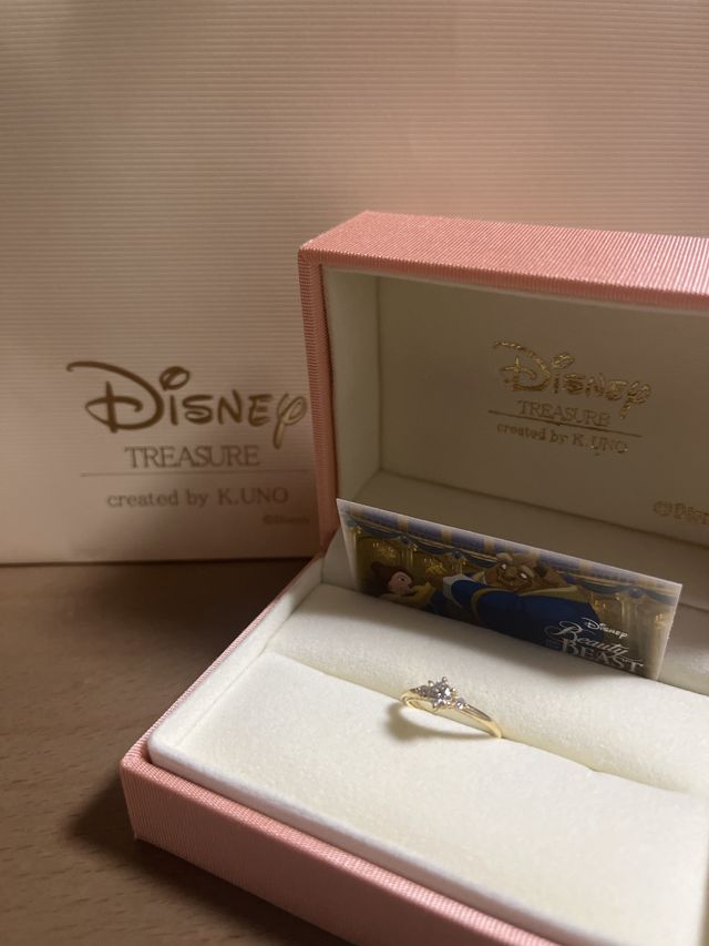 指輪のデザインが美女と野獣の映画で出てくる有名なシーンをモチーフにしたデザインになっています。そのシーンとはベルと野獣がボールルームでダンスを踊っているシーンになっています。そのため、指輪のイエローやダイヤのデザインが綺麗です