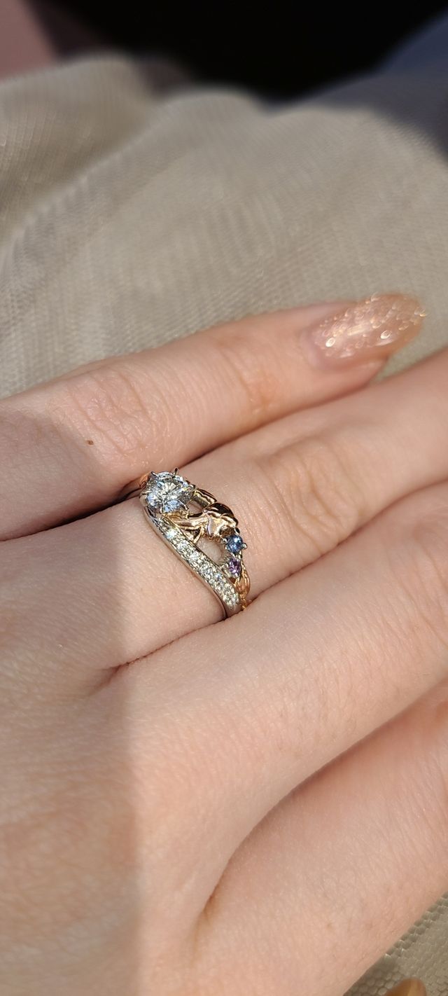 アナと雪の女王2のアナとゲイルをモチーフにフルオーダーしました。もともとアナが好きだったことと、声優を務めてくださっていた神田沙也加さんが好きだったことから、指輪のデザインに反映させるきっかけになりました。