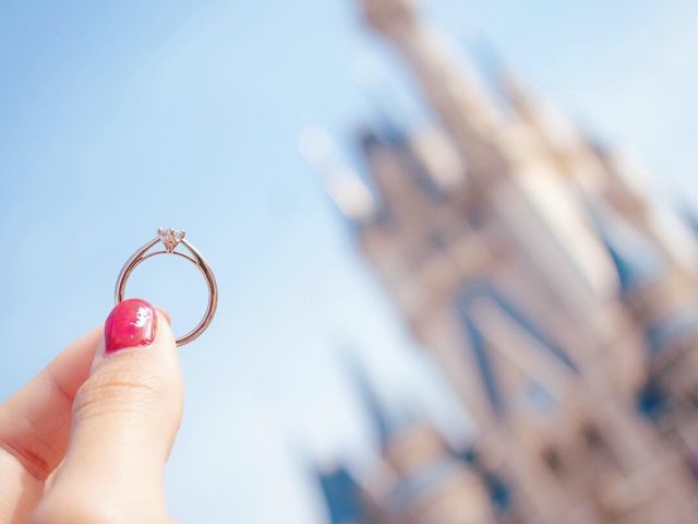 これは旦那がプロポーズの時にくれた。婚約指輪になります。もともとディズニーが大好きな私たちにぴったりな指輪を作れるようにケイウノで一からデザインしてくれました。鉤爪がよく見ると美女と野獣のベルのドレスの様になっているのがとってもお気に入りです。
