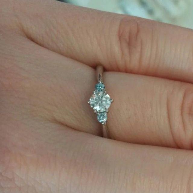 シンプルなデザインですが、サイドのブルーダイヤがアクセントになり可愛らしい輝きが特徴的です。気になったリングを試着していく内にこのリングが自分の指にピッタリだと感じました。つけ心地も良いですし、結婚指輪との重ね付けもマッチすると思いますね。