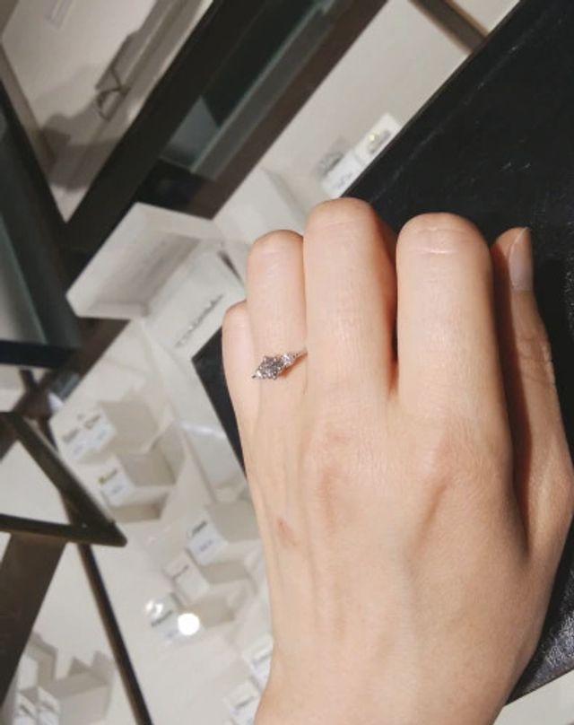 細身のデザインが上品でフェミニンな印象があったこと、さらにはセンターのダイヤモンドだけでなくサイドのメレダイヤも綺麗な輝きだったことが決め手です。しっかりとした存在感があり、自分の指にもマッチしていると感じました。