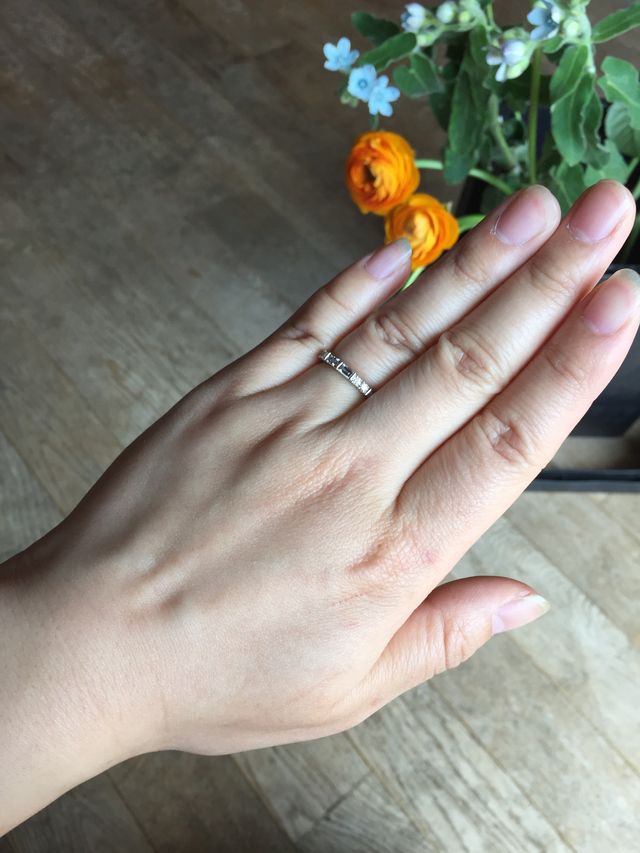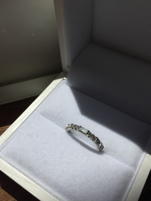 結婚後に婚約指輪をつけなくなるのが嫌だったのでシンプルで日常生活にもつけやすい婚約指輪としてハーフエタニティタイプのものを探していました。こちらのお店はハーフエタニティタイプの種類が豊富で中でもダイヤが長方形にカットされたデザインが他の店ではあまり見なかったのでとても気に入って購入しました。