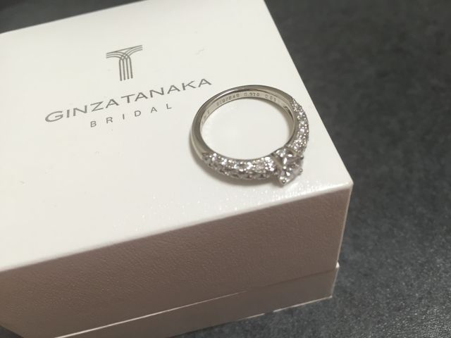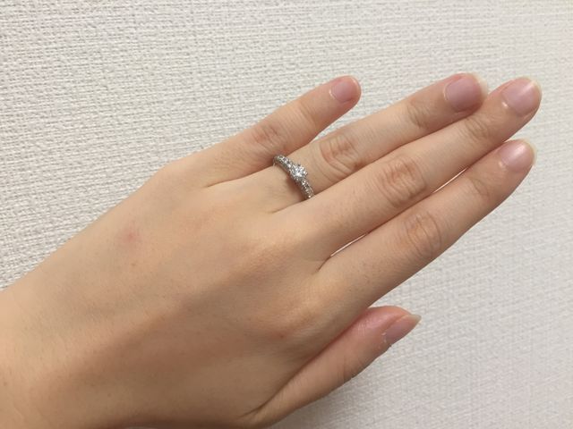 いろいろ試着した中で一番キレイで胸がときめきました。ただダイヤが大きいだけじゃなくて、メレダイヤも含めて全体でのバランスがとてもよかったです。つける前まではきらびやかすぎる気がして惹かれませんでしたが、つけたら意外に指に馴染んだのがよかったです。
