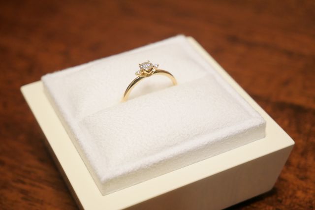 真ん中に一粒のダイヤモンド、さらに横に小さく添えられた二つの小さなダイヤモンドがシンプルさに華やかさも添えてくれて、とても気に入っています。