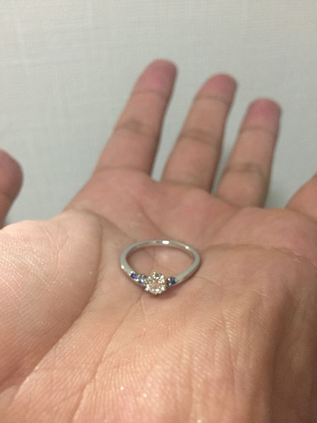 中央のダイヤモンドを中心に青い宝石と小粒のダイヤモンド数個をあしらった、シンプルながらもエレガントさを併せ持ったデザインに惹かれて購入を決めました。