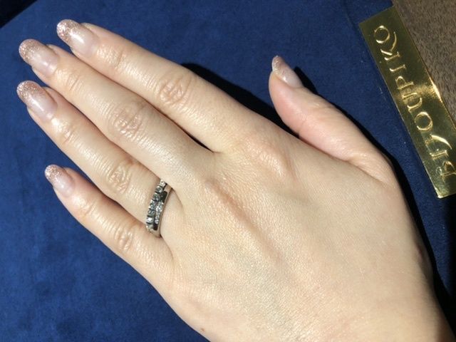 指輪をつけた瞬間のつけ心地に驚きました!シルクのつけ心地と言われてるそうです。最初はシンプルな結婚指輪だけのつもりだったのですが、重ね付けしたエタニティリングがとても素敵で…婚約指輪代わりにと購入することにしました。ぴったりと重なって、つけ心地も良いので日常生活でも安心です。