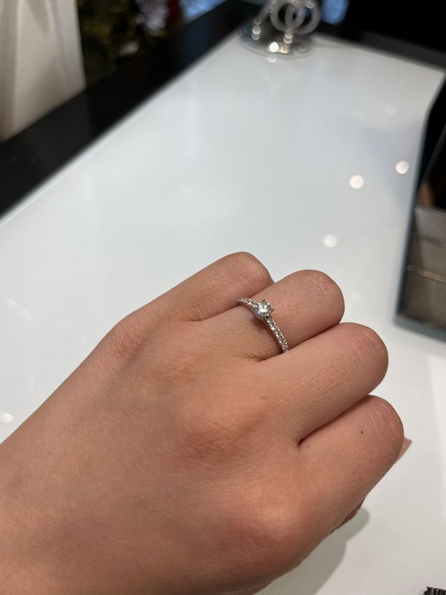 シンプルでかわいいのが決め手です。一粒の周りに小粒のデザインのものにしました。3種類で迷いましたが、1番私の手にしっくりきました。そして、担当の方の意見でこのデザインにしました。本当にかわいいです。宝物です。