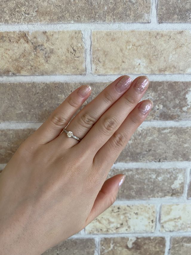 ダイヤとリングのデザインがとても好みでした。リングがダイヤの輝きを邪魔しないようなデザインで、ダイヤの輝きが際立っています。また、滑らかな指通りでつけ心地が最高です。違和感なく、自然に指にフィットする素材です。