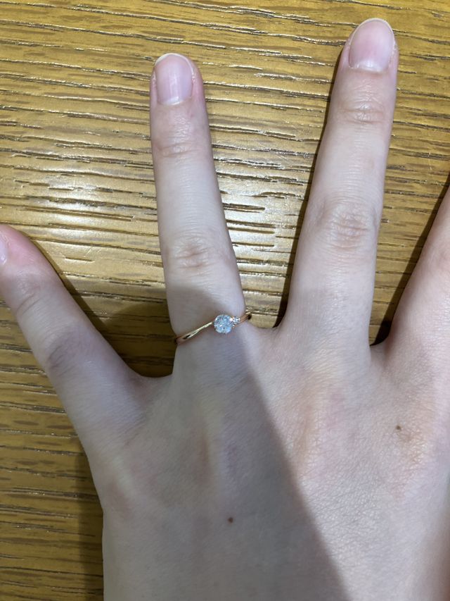 とんでもなく可愛くて圧倒的にお手頃ということで選びました!リングがピンクゴールドでダイヤモンドの隣に小さいダイヤモンドが付いていて、リングのデザインも一工夫あってとても素敵で気に入りました!それなのに経済的なのでおすすめです!