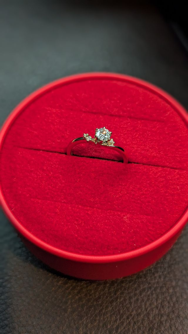 ザ、みたいなデザインよりは遊び心のあるデザインを求めて探していました。アシンメトリーのデザインにサイドの小さいダイヤモンドに、遊び心を感じて決定しました。色は最初ピンクゴールドを考えていましたが、お店の方の助言もあり、カジュアルかつ上品なシャンパンゴールドになりました。