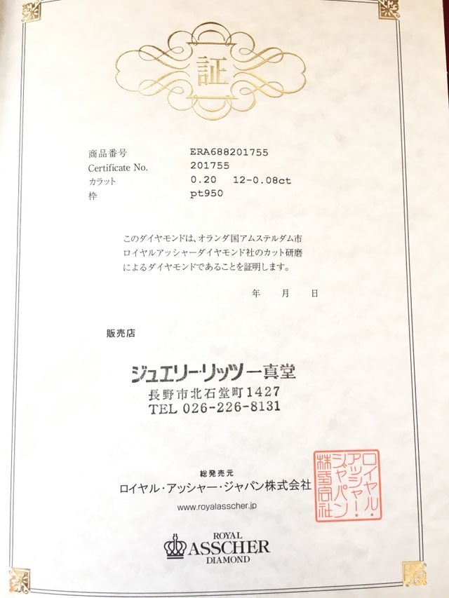 オランダでロイヤルという称号は一業種に一社しか与えられないので、女王から長年の実績と伝統のあるアッシャー社に与えられたそうです。そのためロイヤルを冠することができるのは指輪の業界ではアッシャー社のみとのこと。また、広告をしない点と、価格の割にダイヤモンドのクオリティが高いことがオススメポイントです。