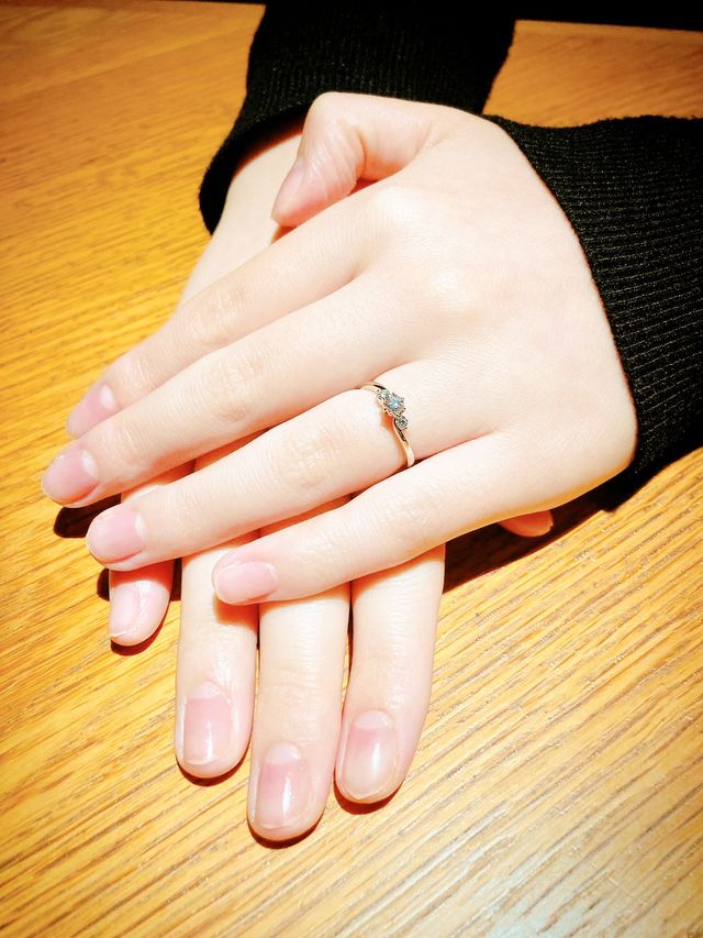 リングにウェーブがかかっていてシンプルですが、ダイヤモンド部分も3つ並んで華やかで、飽きのこないデザインです!結婚指輪と重ね付けしても良さそうかなと思いました。彼女もずっと着けていたいと言ってくれました。