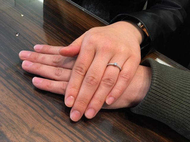 真ん中にダイヤモンドの王道デザインや、ダイヤモンドが3つ並んでいるデザインなど沢山悩みましたが、全体がキラキラと輝いている華やかなこのデザインに一目惚れしました。可愛さもありながらずっと身につけられるエレガントさも兼ね備えていて大満足です✨