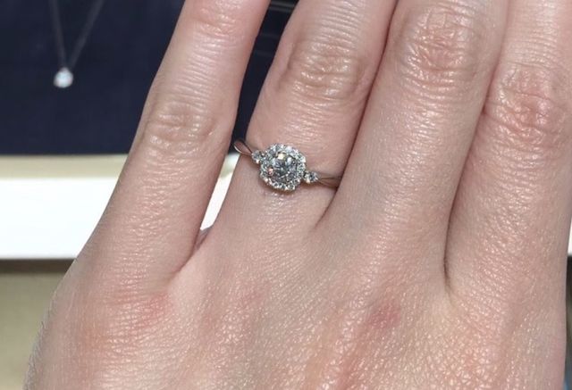 この指輪は中央のダイヤがよりキラキラと輝くように一周小さなダイヤが付いていてとてもゴージャスに見える指輪でした。