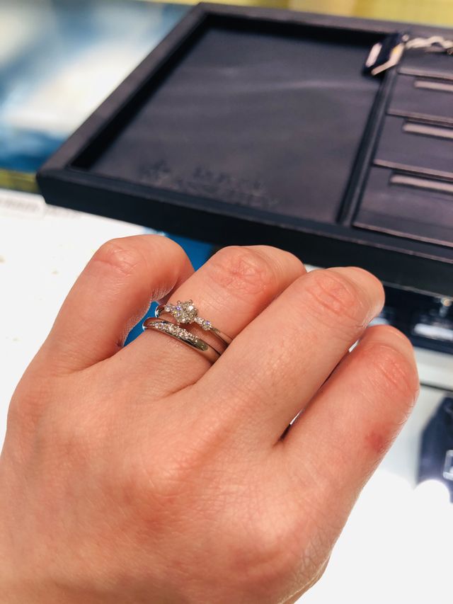 こちらのエンゲージは新作とのこと。両サイドのメレダイヤが少しずつ小さくなることで、中央のダイヤモンドをより大きく見せてくれる効果ぎありました。一粒ダイヤのソリティアの同じカラットと比べても、その差は明らかでした。