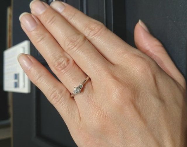 ダイヤモンドが一粒のタイプで最初は選んでいましたが、三粒のタイプの方がより華やかで存在感があること、さらに一見大きな一粒タイプにも見えることが決め手になり、こちらのリングを選びました。白く輝く特徴的なダイヤはとても綺麗ですね。