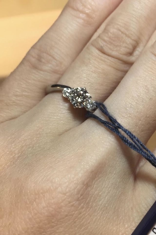 中央の石の横にサイドに石がついているタイプです。真横ではなく、少し斜めになっている点が良いと思いました。ロイヤルアッシャーはヨーロッパ系のカッターということで、白く綺麗に輝いていました。値段も比較的良心的に感じました。