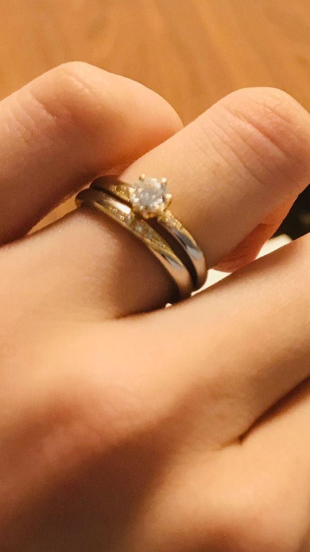もともとは違うデザインを購入しようと思っていましたが、婚約指輪は立て爪のデザインがいいと店員さんに教えてもらい、その中で、プラチナとゴールドゴールド2色のデザインであるこちらのリングがとても気に入りました。
