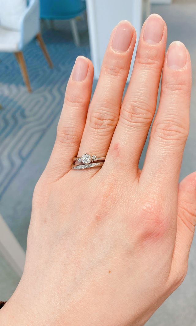 婚約指輪のダイヤが、より大きく見えるセットリングでした。ウェーブのデザインから、組み合わせを選べたので、様々な組み合わせを試してみて合うものを探せました。指輪と指輪の隙間がややありますが、気になりませんでした。