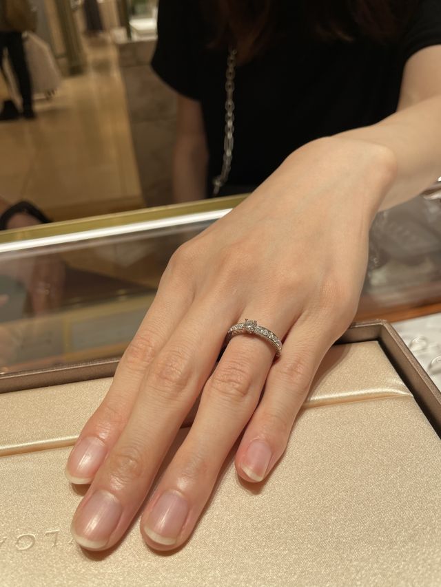 ダイヤが大き過ぎず普段使いしても浮かないようなものを探していました。リング自体にもダイヤが施されていて華やかな印象。リングにはつけていても見える位置、横側にBVLGARIと刻印されていておしゃれでした。