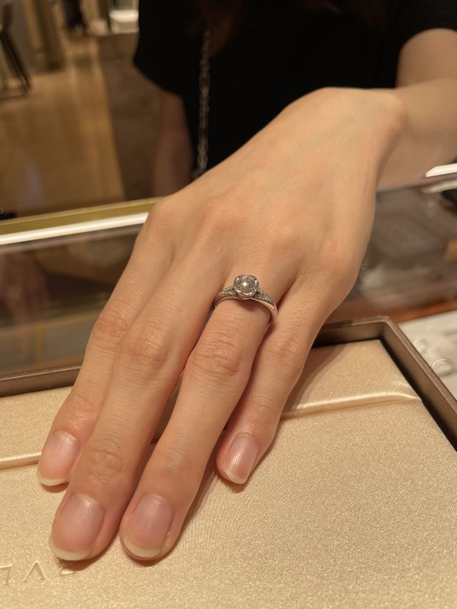 指の関節が太いことがコンプレックスで、リングが細過ぎないものを探しており、こちらを試着しました。実際に試着してみてもリングが程よい太さでした。中央のダイヤも大きく見えて、かなり華やかなのもすごく素敵でした。