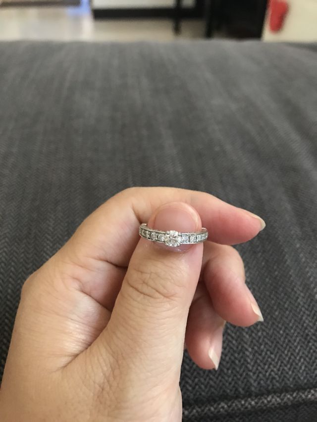 デザインがとても気に入りました。ダイヤが一粒なのが一般的ですが、周りにもダイヤが付いているので豪華に見えます。フレームがあるのでボリュームもあるように見えます。ティファニーやカルティエより豪華に見えるので、おすすめです。