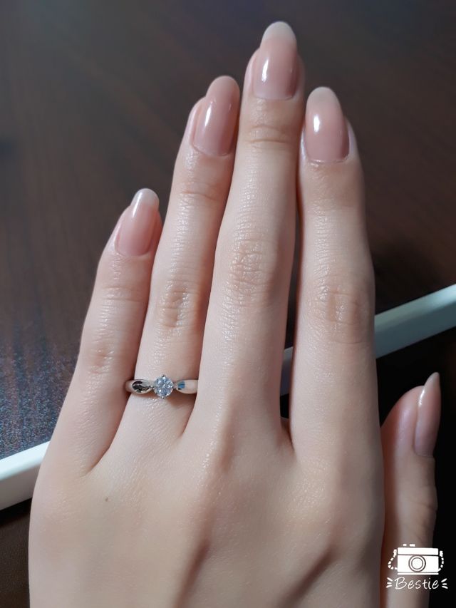 ダイヤにむかってリングがきゅっとなっているデザインがとても可愛く、気に入りました。同じようなデザインを何個か見て回りましたが、リングの太さとダイヤのバランスが絶妙で、値段はすこし張りましたが、一生ものなのでこちらの指輪にしてもらいました。