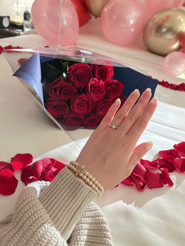 ダイヤの回りにもたくさんのダイヤモンドがついていて、すごくキラキラしています。着けるとテンションが上がるような、そんな指輪です。憧れのブランドだったの