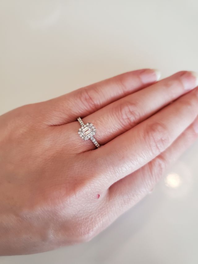 デザインはシンプルなエメラルドカット。素材はプラチナとダイヤモンド。シンプル好きの私が婚約前から憧れていたものです。普段でもドレスアップした時に着用でき、歳を重ねてもつけられるデザイン。同ブランドの結婚指輪に重ねづけするとより豪華になります。