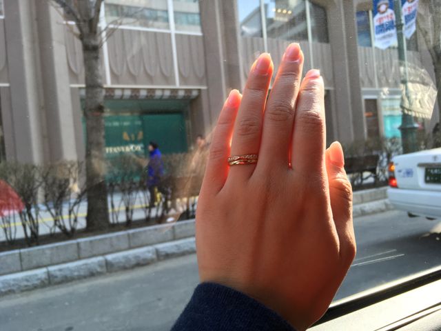 指輪にこだわりはなかったですが、是非贈らせて欲しい!と夫からの要望があったので、百貨店に行きました。もともとブランド物にそこまでの興味はなく、数あるお店の中から何十も種類のあるものを選ぶことが面倒でした。でも、何となく入ったお店のブルーボックスはとても魅力的でした。いくつかお店を回った中で、私が一番反応が良かったと夫が感じたティファニーで結婚指輪と婚約指輪をプレゼントしてもらいました。立て爪のものは着用できる機会が限られそうなのでフラットでダイヤがたくさん付いているタイプを選びました。