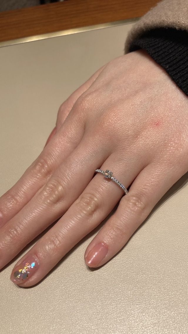最初は一粒のものを探していたのですが、横もダイヤが付いているものを見た時可愛すぎて気に入りました!!ダイヤの形も四角くティファニーカットになっているのも少し大人っぽさもでて、長く使えそうだなと思いました♡