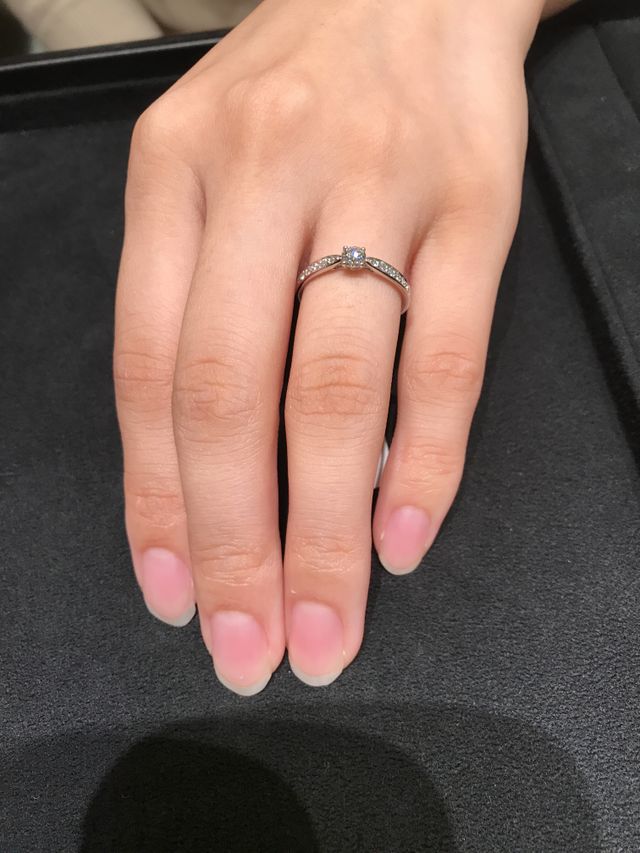 婚約指輪といえば、憧れのティファニーです。ダイヤモンドの輝きがとても美しく、デザインもシンプルながら王道の婚約指輪で素敵でした。指輪をはめた時に指がすっと綺麗に見えるデザインで、つけ心地も違和感なく良かったです。