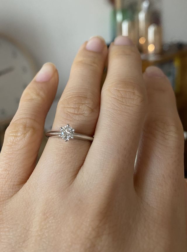 夫(当時彼氏)がサプライズで選んでくれました。有名ブランドであるTiffanyとCartierで迷ったそうですが、私の雰囲気に合っているTiffanyに決めたそうです。Tiffanyの中でもシンプルで王道なものが良いということで、ティファニーセッティングを選んでくれました。