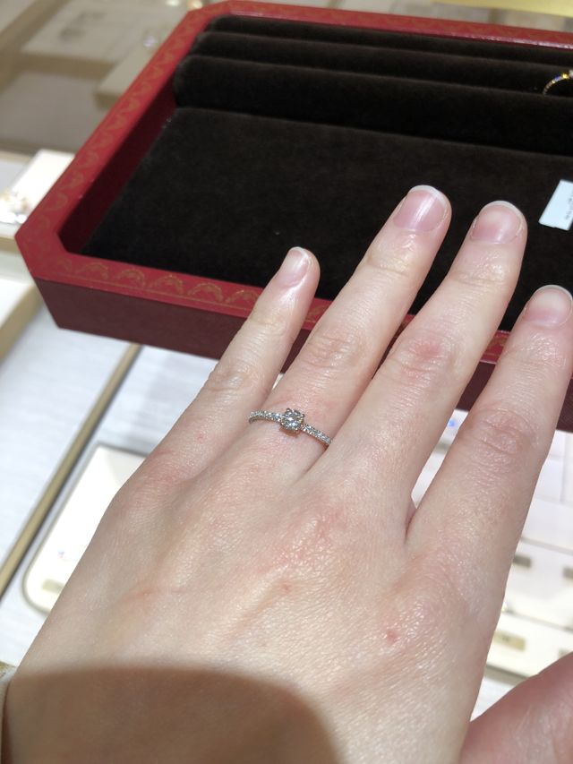 個人的に、まさしく婚約指輪のようなものはあまりピンと来ず、もう少したまのお出かけでも使えそうなカジュアルっぽいものが欲しいと思っていました。ネットで見て華奢なデザインが素敵だと思い、実物を付けて一目惚れ。キラキラが堪らなくかわいいです。