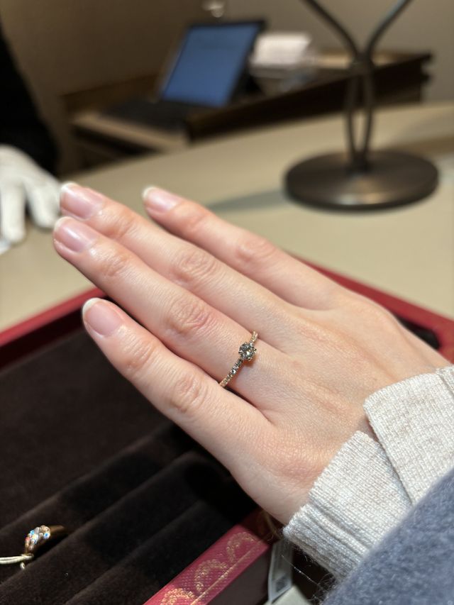 華奢で繊細なデザインでありながらもダイヤモンドのゴージャス感があり素晴らしかったです。プラチナだけでなくイエローゴールドの指輪も試してみたかったので試着させてもらいました。ゴールドは可愛らしくなる印象でした。
