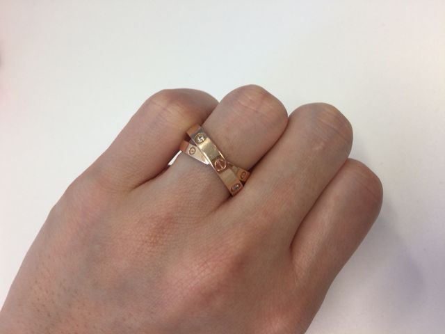 憧れだったラブリング。婚約指輪は毎日でもつけられるようにある程度カジュアルな物にしようと決めていましたので、ゴージャスで綺麗なのに遊び心もあるラブリングにしました。実際見に行ってみると、クロスしているデザインのものが新作で登場していて一目ぼれ。ダイヤも6個ついています。女性らしくピンクゴールドがあったのも即決のポイントでした。