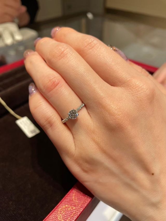 元々、バレリーナソリテールリングやLOVEリングを着けてみたいと思い試着しましたが細めの指にはボリュームがありすぎてしまい、こちらのパヴェタイプのリングを試着しました。