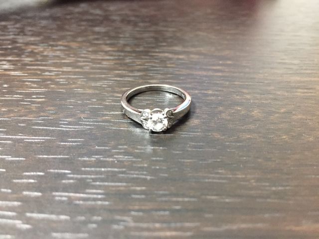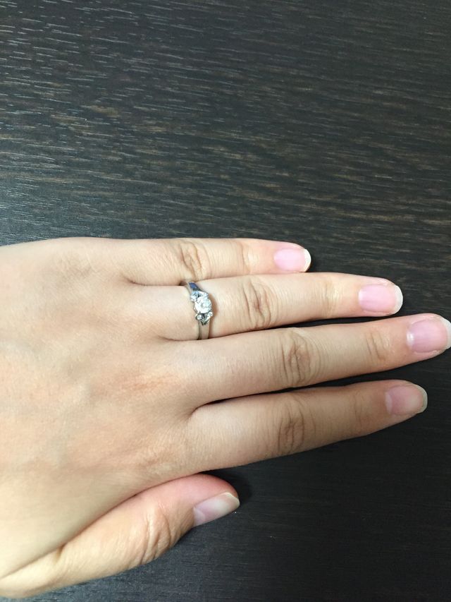 立て爪のダイヤモンドの脇に小さいダイヤモンドがまるで舞台になっていて、立て爪のダイヤモンドを引き立てているデザインに一目惚れしました。