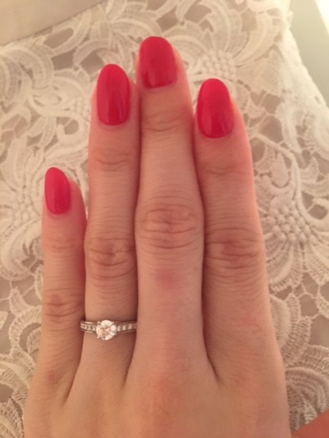 当初は「THE婚約指輪」のような、立て爪の一粒リングを検討して他の海外ブランドにも試着にいきましたが、せっかく買っていただくものなので、普段からできるだけつけたくて、普段のファッションにも違和感のないデザインのパヴェ付きを選びました。