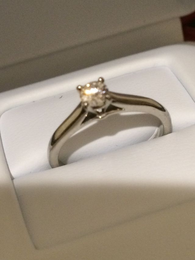 ダイヤの質・大きさといったコストパフォーマンスを考えれば、ルースの状態でダイヤを購入するのがいいと考えましたが、一生に一度の機会なので憧れのブランドということでこちらに決めました。カルティエの中で安価でシンプルなものがソリテールでした。ティファニーの同タイプ(立て爪)と迷いましたが、ダイヤを支える爪が4本であること(ティファニーは6本)、横から見た際にダイヤに向かって滑らかな曲線を描いているプラチナが美しかったのも決め手となりました。