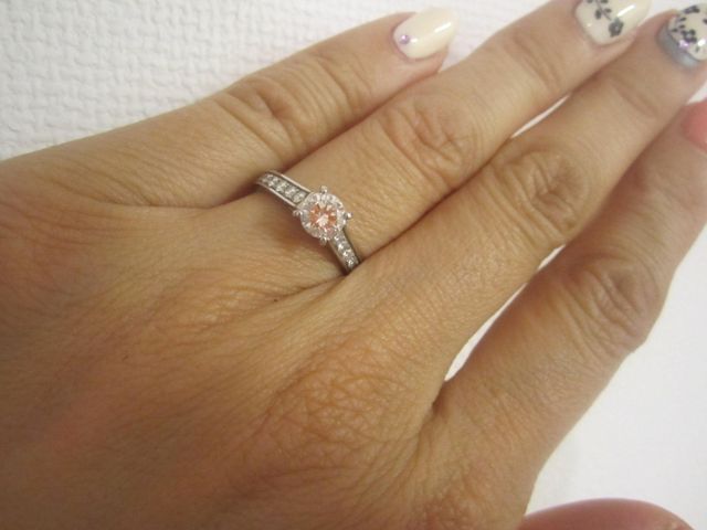 一粒ダイヤの横にパヴェダイヤが入っているタイプ希望でこちらのものにしました。指がごつごつしているので華奢なものではなくごつごつに負けない華やかなデザインのほうがごつごつが目立たないように思います。パヴェダイヤなしのタイプもありましたが私はパヴェダイヤ入りにしました。
